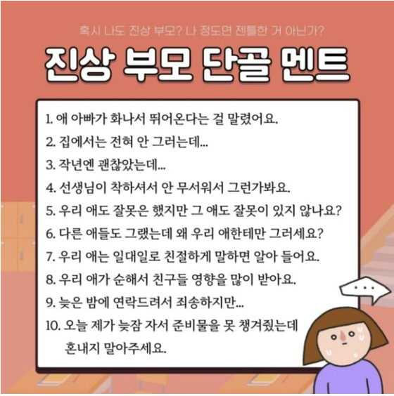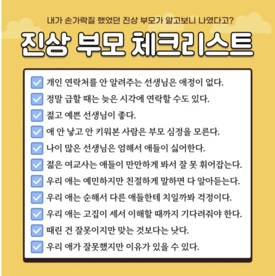 맘카페에서 다음과 같이 진상 부모 체크리스트가 만들어서 인터넷에 올라오고 있다.